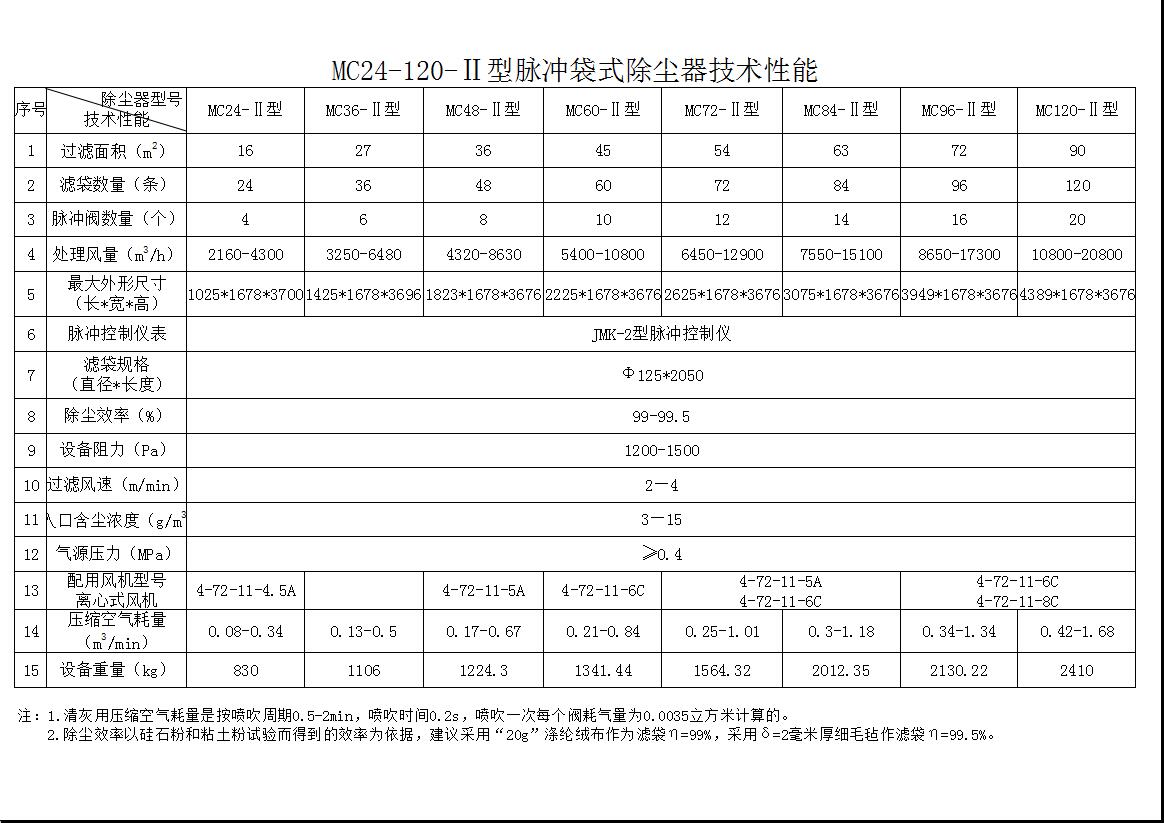 MC-Ⅱ型脈沖袋式除塵器有灰斗,進(jìn)氣口,上箱體、下箱體(內(nèi)置除塵過濾布袋)、出氣口、引風(fēng)機(jī)、電磁閥及配套氣泵組成。工作時(shí),含塵氣體由進(jìn)氣口進(jìn)入灰斗,粗粒塵直接落入灰斗底部,細(xì)粒塵隨氣流向上進(jìn)入上箱體,粉塵積附在濾袋外表面,凈氣通過各濾袋口匯集到上箱體內(nèi)至出氣口經(jīng)引風(fēng)機(jī)排出。隨過濾過程的不斷進(jìn)行,濾袋外表層積塵逐漸增多,從而使收塵器阻力增高,當(dāng)阻力升至一定范圍(1200~1500Pa),清灰控制系統(tǒng)發(fā)出信號,通過自動脈沖控制儀打開脈沖閥,壓縮空氣經(jīng)噴管向每條濾袋噴射氣流,使濾袋產(chǎn)生變形,震動,積附在濾袋外表面的粉塵被吹落至灰斗內(nèi),達(dá)到清灰的目的。