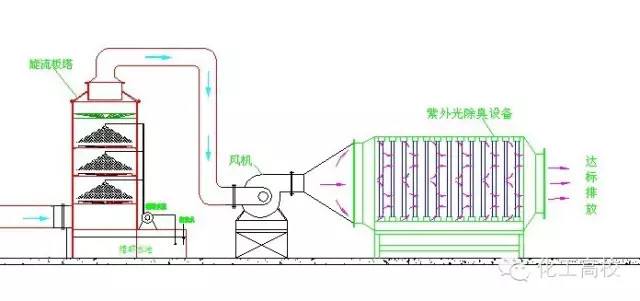 原理:反應(yīng)塔內(nèi)裝填特制的固態(tài)填料,填料內(nèi)部復(fù)配多介質(zhì)催化劑。當(dāng)惡臭氣體在引風(fēng)機(jī)的作用下穿過(guò)填料層,與通過(guò)特制噴嘴呈發(fā)散霧狀噴出的液相復(fù)配氧化劑在固相填料表面充分接觸,并在多介質(zhì)催化劑的催化作用下,惡臭氣體中的污染因子被充分分解。適用范圍:適用范圍廣,尤其適用于處理大氣量、中高濃度的廢氣,對(duì)疏水性污染物質(zhì)有很好的去除率。優(yōu)點(diǎn):占地小,投資低,運(yùn)行成本低;管理方便,即開(kāi)即用。缺點(diǎn):耐沖擊負(fù)荷,不易污染物濃度及溫度變化影響,需消耗一定量的藥劑。
